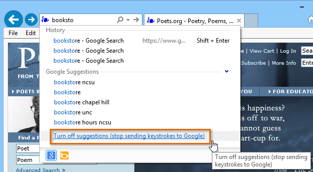 If you don't want the browser to suggest search terms as you type, click Turn off suggestions (stop sending keystrokes to Google).
