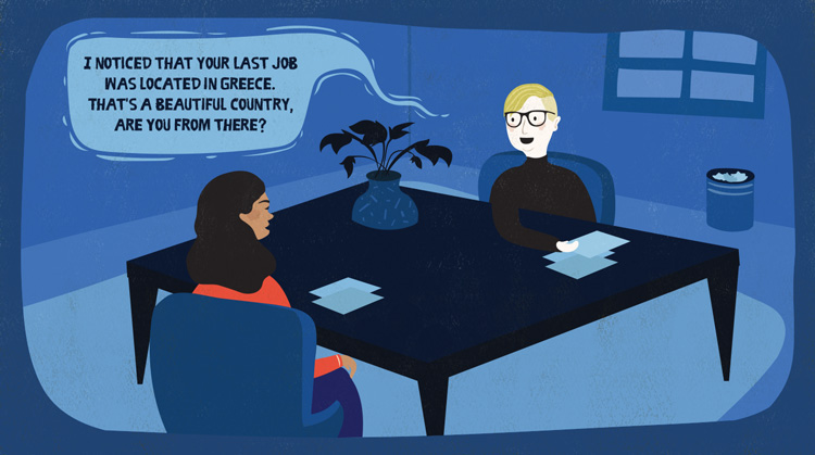 In this example, it seems like the interviewer is trying to make conversation, but this question could lead to discrimination. If you're uncomfortable answering, one way you could respond is by redirecting the question or responding with another question. You could say something like, "It really is a beautiful place, and I loved the time I spent there. Do you travel often?"