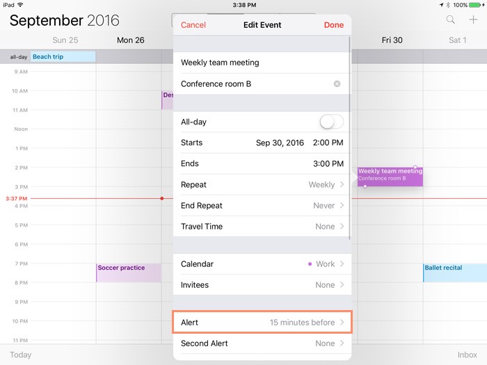 If you want to be reminded about a certain event, you can set an event alert. For example, you could an create an alert to sound 10 minutes before an event begins. To set an event alert or add other event details, tap the event, then tap Edit. You can also edit these details when creating the event.
