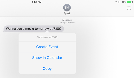 The iPad will try to intelligently guess when certain text refers to an event. For example, if someone sends you a message that says Wanna see a movie tomorrow at 7:00?, the words tomorrow at 7:00 will be underlined. Tap the underlined words to create an event.