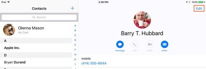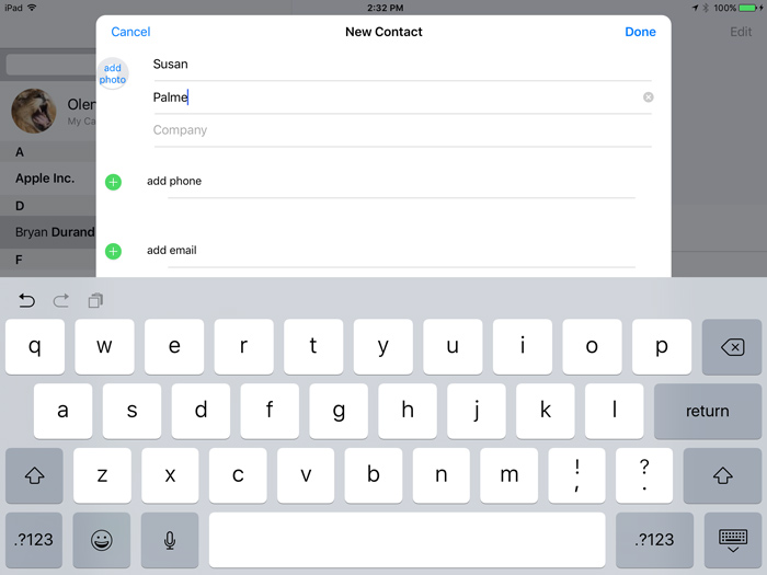 If you want to add or edit several contacts at the same time, you might find it easier to use a computer with a traditional keyboard. To do this, simply navigate to www.iCloud.com, click Contacts, then add or edit your contacts as needed. When you're done, the information will be automatically synced to your iPad.