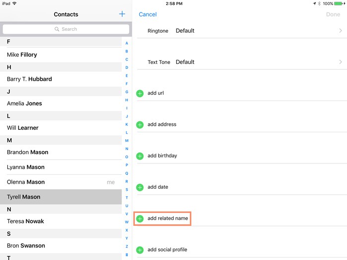 You can also manually set a relationship label for a contact. When viewing the contact, tap Edit, then scroll down and select add related name.