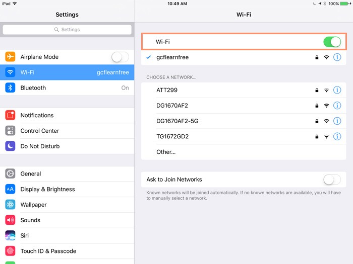 You'll need to connect your iPad to the Internet to be able to use most of its features. It's easy to turn your iPad's wireless connection on or off and join nearby networks so you can go online. Once you join a network, your device will connect to it automatically whenever it's in range. If there are no networks in range, it will connect via 3G or 4G instead, but only if you have a 3G- or 4G-enabled device (and a contract with a wireless provider).