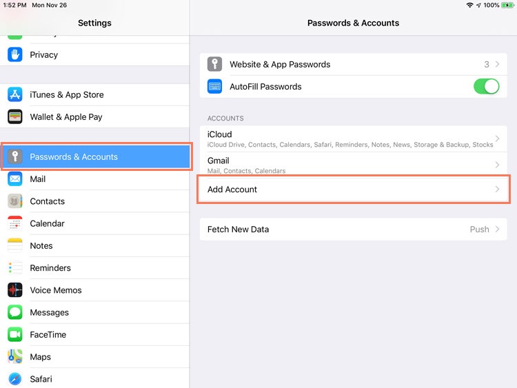 To add another email account, open Settings from the Home screen, tap Passwords & Accounts in the left pane, then select Add Account. Follow the instructions to connect the new account.