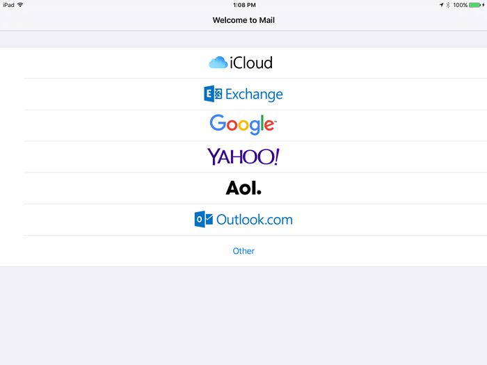 The first time you open the Mail app, you'll need to connect it with an existing email address. Select your email provider, then follow the instructions to connect your account with the Mail app. When you're done, you'll be able to send and receive emails from that account on your iPad.