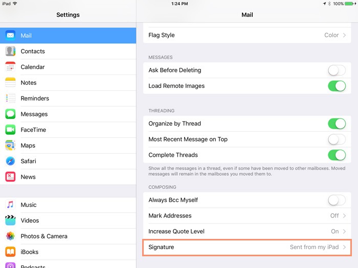 By default, every email you send will include the words Sent from my iPad at the bottom of the message. This is the default email signature for the Mail app. If you'd like to customize or remove the email signature, open Settings from the Home screen, tap Mail in the left pane, then select Signature.