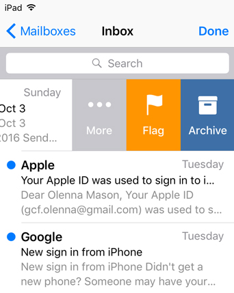 The Mail app includes several convenient tools to manage your inbox, including folders and flags. You can also swipe a message to the left for the option to archive or delete, reply, forward, and more.
