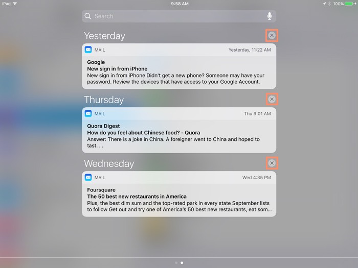 Notifications will remain in the Notification Center until they are dismissed, or cleared. To clear a notification, tap the X, then press Clear.