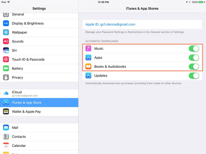 If you purchase something on another device from the iTunes Store or App Store, you may want it to appear automatically on your iPad. To enable this feature, open Settings, tap iTunes & App Store, then turn on the Music, Apps, and Books & Audiobooks controls.