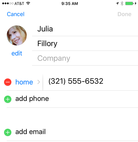 When creating a contact, you should (at the very least) enter a first and last name and a phone number. However, you can also enter other information, like an email address, street address, and birthday.