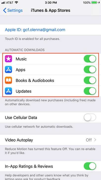 If you purchase something on another device from the iTunes Store or App Store, you may want it to appear automatically on your iPhone. To enable this feature, open Settings, tap iTunes & App Store, then turn on the Music, Apps, and Books & Audiobooks controls.
