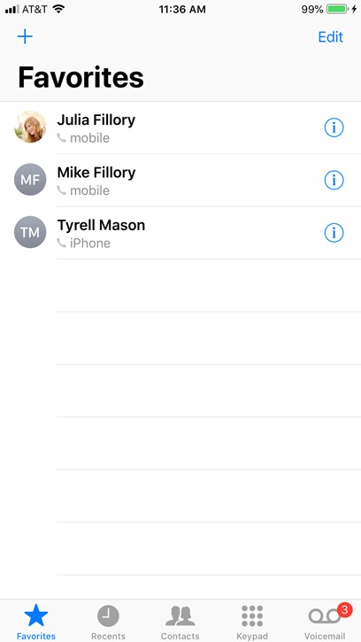 If you frequently call the same contacts, you can add them to your Favorites list. You may find this more convenient than selecting a contact from your Contacts list. To add an existing contact as a favorite, open the Phone app, select Favorites, then tap the + button. To call a favorite, simply tap the desired contact.