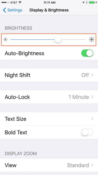 If you're having difficulty viewing your iPhone's screen, you may want to adjust the screen brightness. Decreasing the screen brightness will also help to save battery life. From the Display & Brightness setting, drag the slider to increase or decrease the brightness. You can also change this at any time by swiping up from the bottom of the screen to access the Control Center.