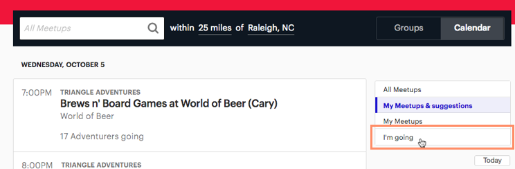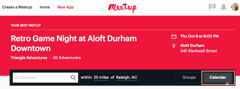 - On the Meetup homepage, it should be set to display Calendar instead of Groups. If it's not, click the Calendar button on the right side of the screen.