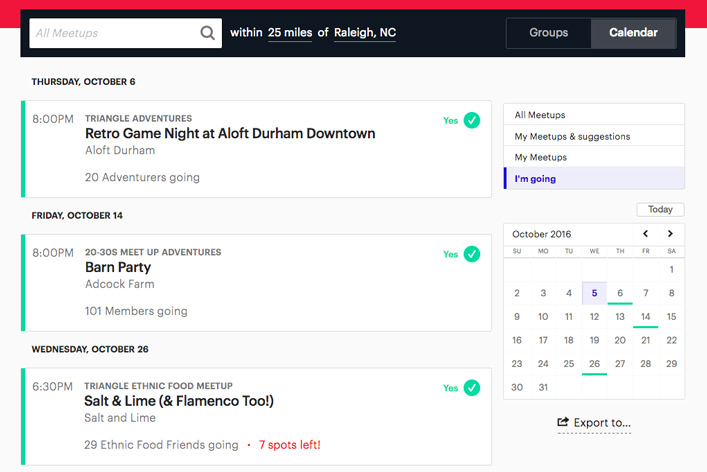 If you see an event you're interested in, it's a good idea RSVP to it. Not only will Meetup add it to your calendar, but it will also give the organizers a better idea of how many people will be attending.