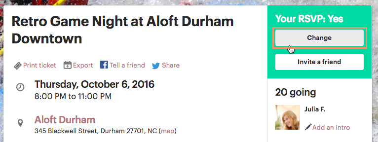- If you need to change your RSVP, you can always click the Change button located on the right-side pane of the event where the initial RSVP button was.