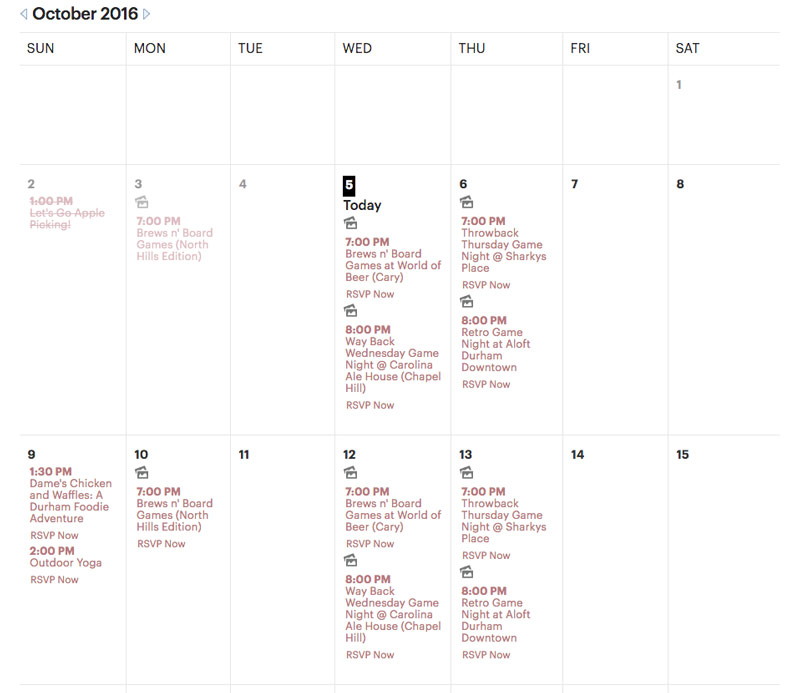 Once you've joined a Meetup group, you'll have access to its entire calendar of upcoming events. Some Meetup groups have weekly recurring events, while others only meet occasionally.