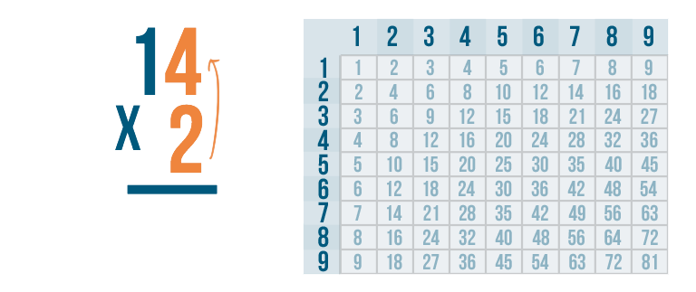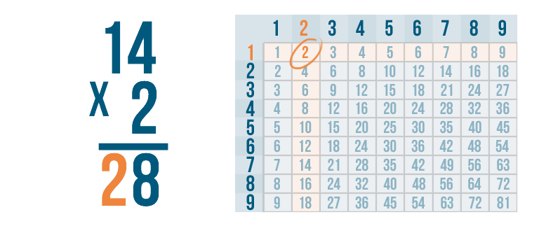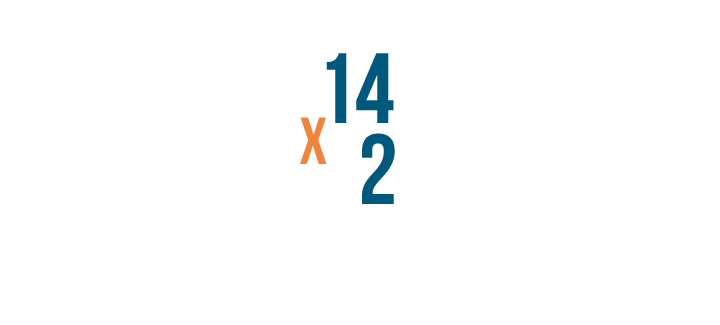 We'll multiply 2 by the top number, 14. Since there's no 14 in the times table, we'll have to multiply one digit at a time.