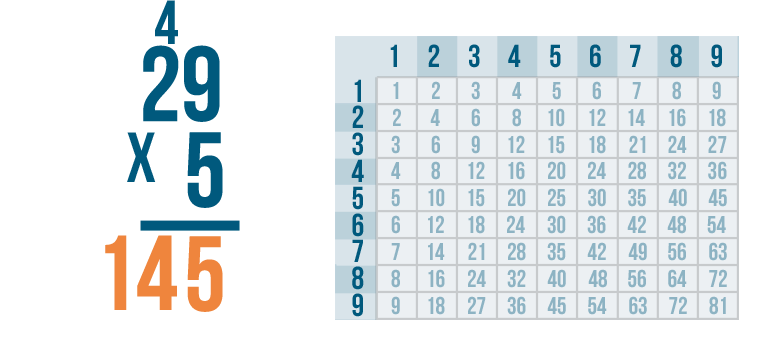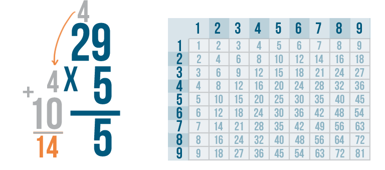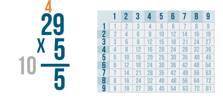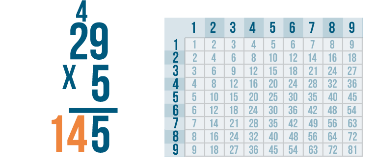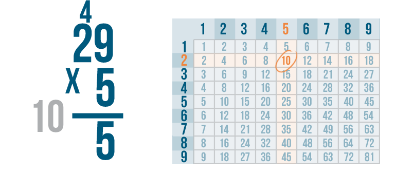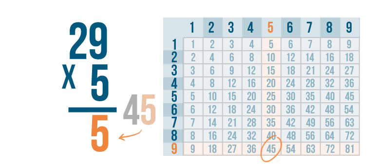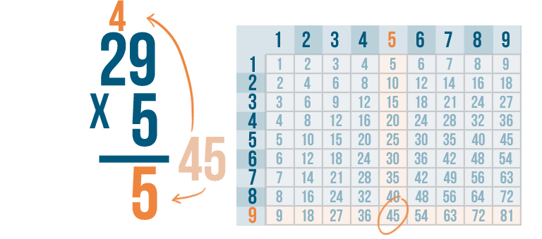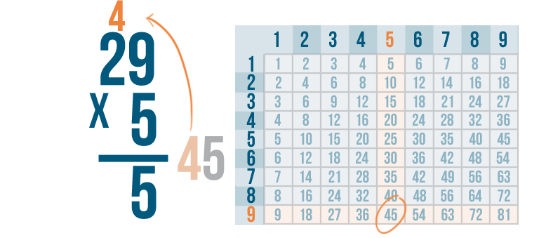 See how it works? We multiplied 5 and 9 to get 45. We put the 5 underneath the line, carried the 4 and placed it above the next set of digits.