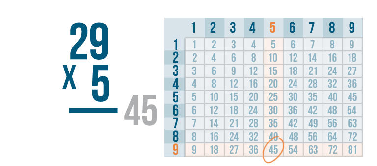 According to our times table, 5 x 9 is 45, but there's no room to write both digits underneath the 5 and 9.
