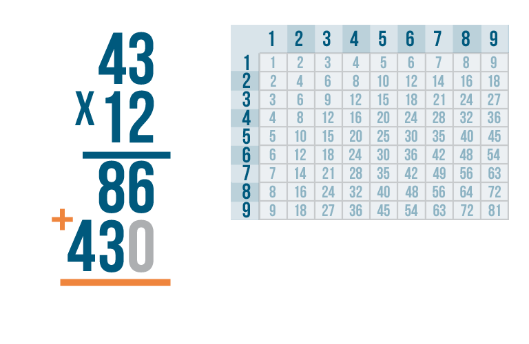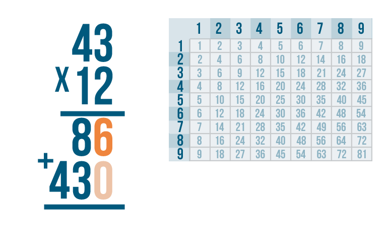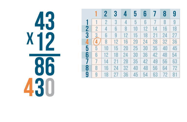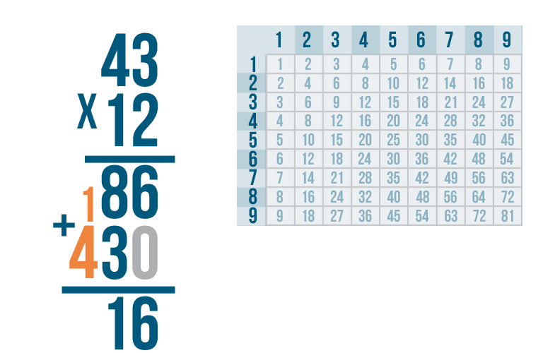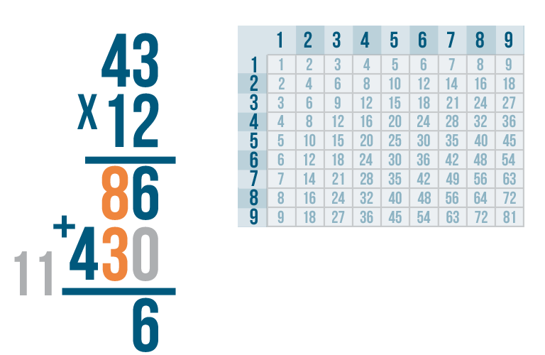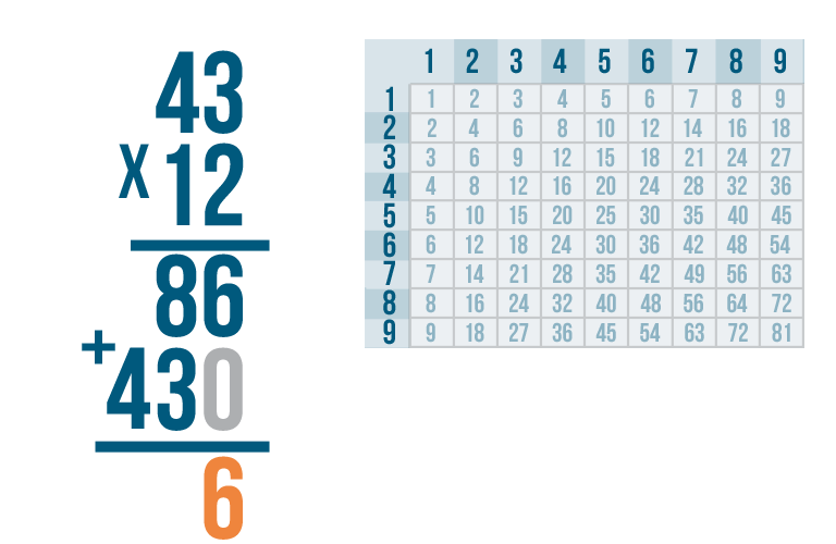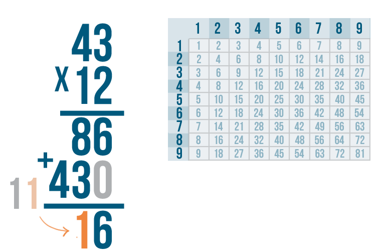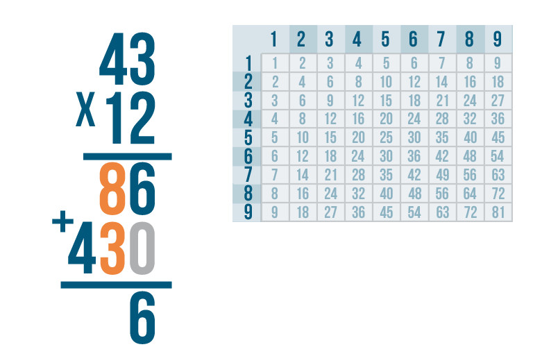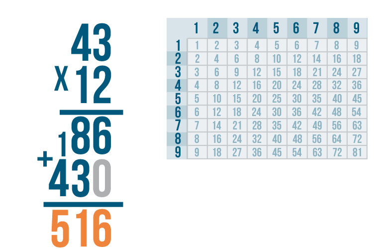 We're done! Our total is 516. In other words, 43 x 12 = 516.