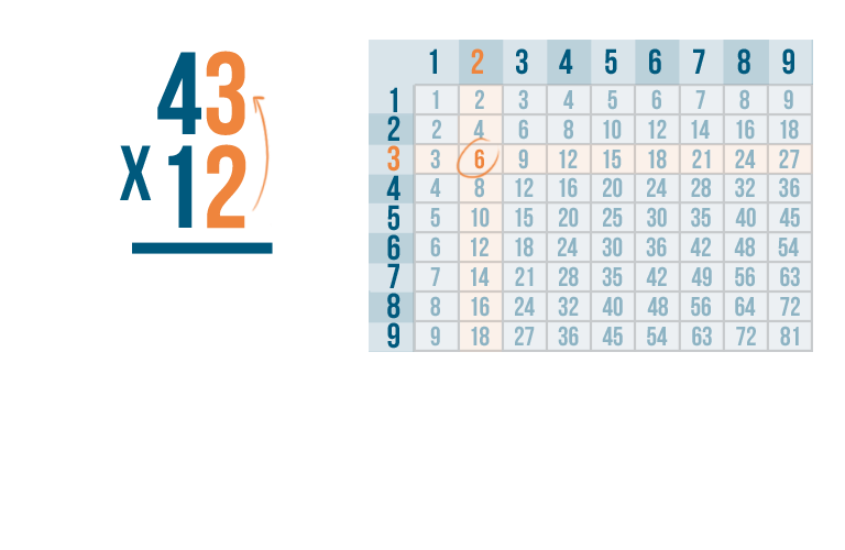 When you multiply stacked numbers, you start with the right digit in the bottom number of the problem. Our bottom number only has one digit: 2.