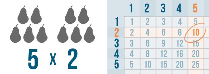 When you multiply a number or amount, you're increasing it many times. In Introduction to Multiplication, you learned that multiplication can be a way to understand things that happen in real life. For instance, imagine that a store sells boxes of pears. The small boxes contain five pears each. You buy two. You could write the situation like this, and use the times table to solve it: