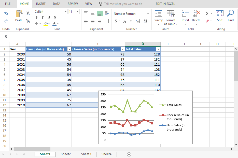 Excel Online contains many of the most useful Excel features. For example, you can perform calculations with formulas. You can even organize your data into tables and charts, although you won't be able to do much to customize their appearance.