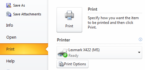 From the Print pane, you'll be able to print the currently selected item and view a Print Preview.