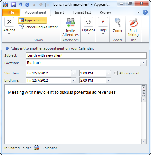 Outlook 2010 includes powerful scheduling features in Calendar view. From there, you can create appointments and manage your time.