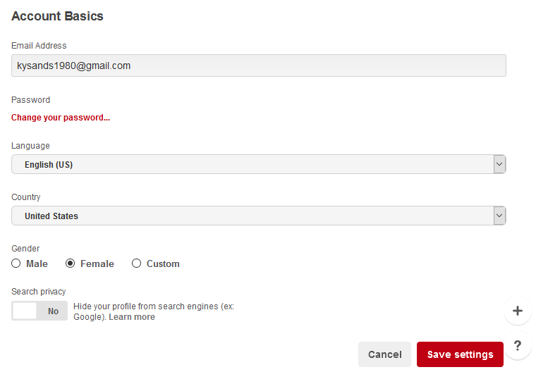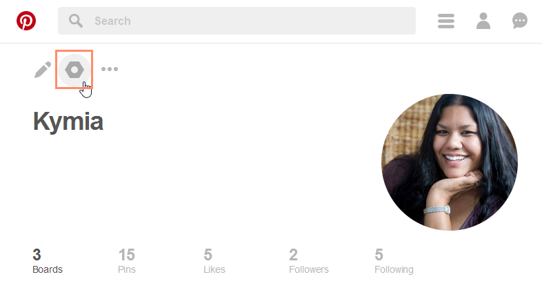 There are several settings you can change on Pinterest. To access your account options, go to your profile, then select the hexagon-shaped gear icon to get to Account Basics.