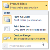 There may be times when you want to print something with a single click using Quick Print. This feature prints the document using the default settings and the default printer. In PowerPoint 2010, you'll need to add it to the Quick Access toolbar in order to use it.