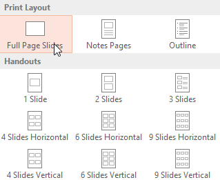 • Full Page Slides: Prints a full page for each slide in your presentation
