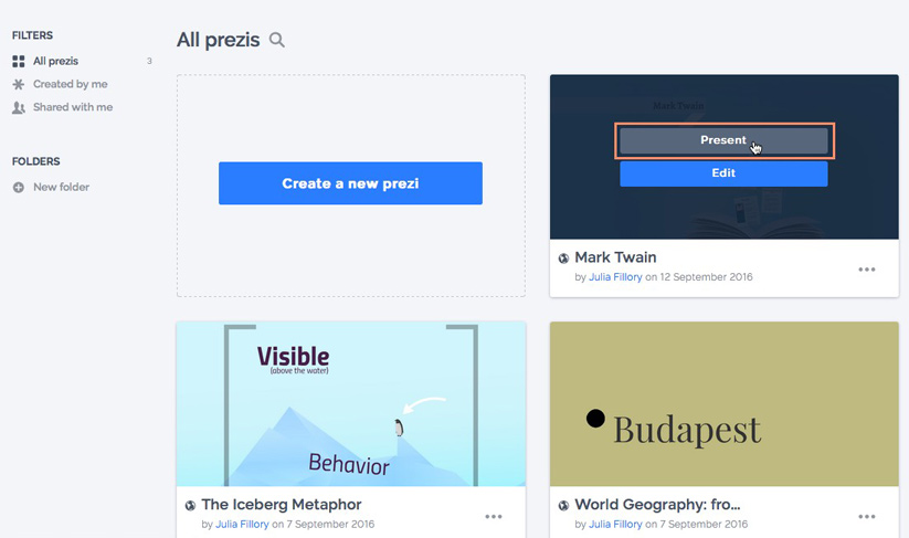 Whether you've finished your prezi or you'd like to preview it while working on it, Prezi makes presenting easy to both access and navigate. While you've been creating your prezi, you've been using Edit mode. In this lesson, we'll go over how to open and use Present mode. In Present mode, all of the menus and tools from Edit mode will be gone, leaving only the frames you've created.