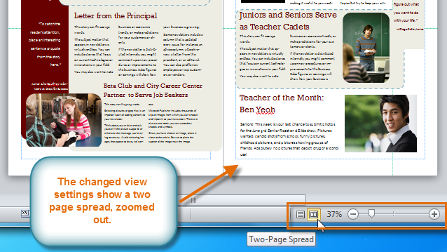 You can view multi-page publications as either a single page or a two-page spread. To toggle back and forth between these views, simply click the icons on the Views toolbar. To view more or less detail in your publication, you can zoom in or out by clicking and dragging the slider.