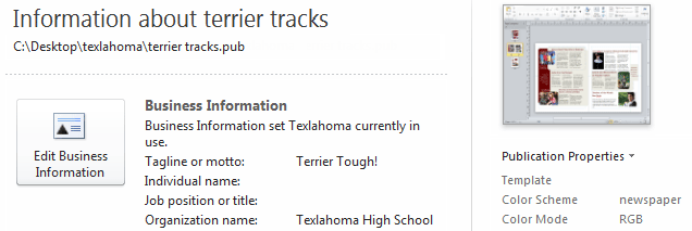 Info contains information about the current publication. You can also Edit Business Information if you want Publisher to automatically add information like your business's address and phone number to the publications you create from templates.