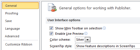 Here, you can change various Publisher options. For example, you can adjust the spelling and grammar check settings, AutoRecover settings, and Language preferences.