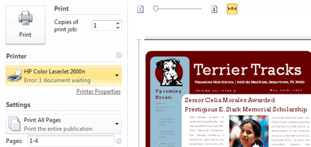From the Print pane, you can change the print settings and print your publication. You can also see a preview of how the publication will look on the page.