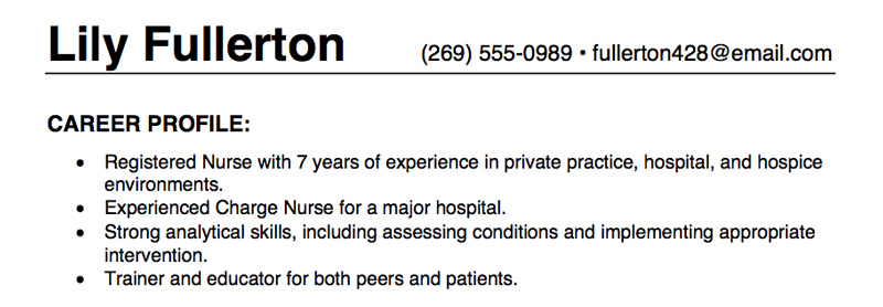 Lily chose to include a career profile to summarize her experience and highlight the key things she wants the hiring manager to know about her. She used a bulleted list to make it easy to scan.