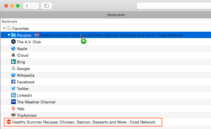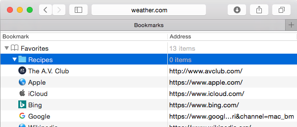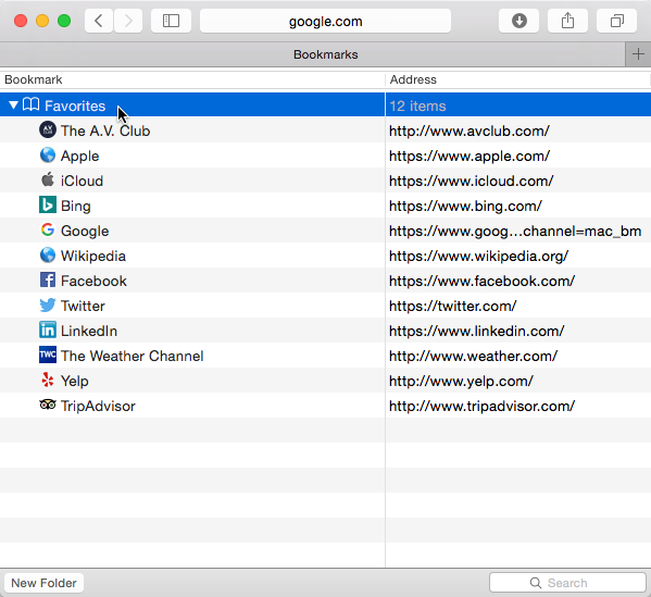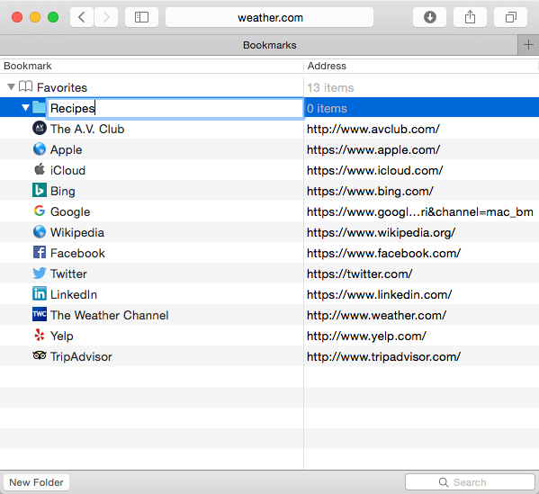 - By default, new bookmarks are saved to the Favorites folder. If you'd like to save them somewhere else, click the Folder drop-down menu and select the desired folder.