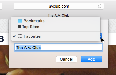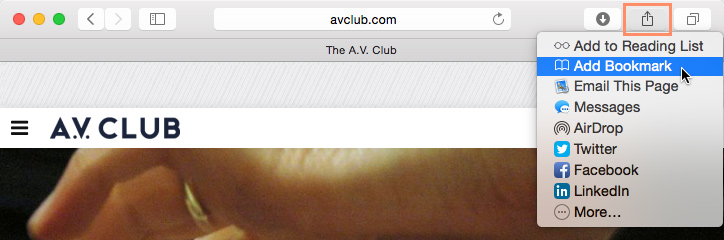 - Click the Share button in the top-right corner of the window, then select Add Bookmark. You can also press Command+D on your keyboard.