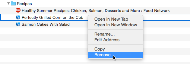 - To delete a bookmark or folder, right-click the bookmark, then select Remove.