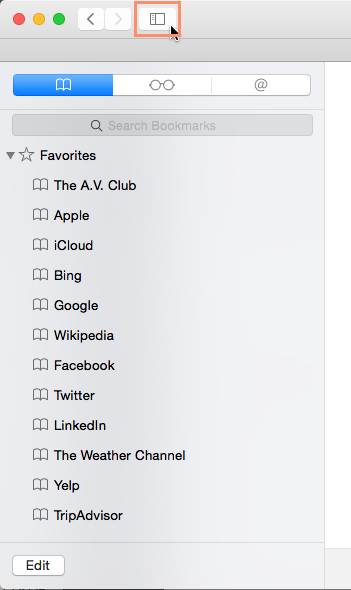 - The Sidebar button: Click the Sidebar button in the top-left corner of the window to see all of your bookmarks in a sidebar. Simply click a bookmark to open it. Click the Sidebar button again to hide the sidebar.