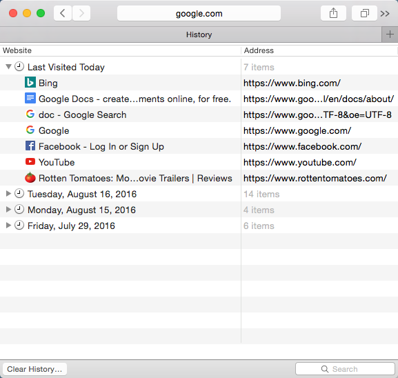 - The History will appear in a tab with your recent browsing history. The history includes every site you've viewed in the past week. The list is sorted by date, so the most recent history appears at the top of the page. If you want to return to a website, simply double-click the link.