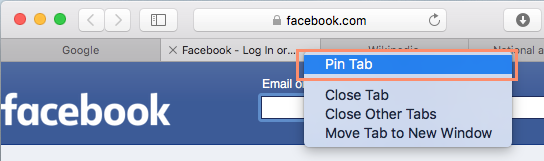 If there are some pages you use every time you open your browser, like your email or calendar, you might consider pinning the tab. Pinned tabs will open automatically whenever you start Safari, making your favorite pages easy to access.