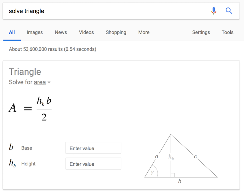 If geometry is giving you trouble, type solve along with a shape such as triangle or rectangle. This will bring up the geometry calculator, from which you can solve for numerous aspects of a shape.