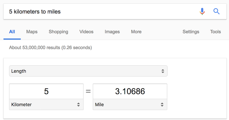 You can convert many types of measurement, including distance, weight, and temperature. For example, type 5 kilometers to miles, or 30 quarts to gallons to get an instant conversion. You can also use abbreviations, like f for Fahrenheit or kg for kilograms, to keep your typing to a minimum.