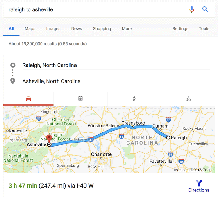 To find the distance between places, enter two different locations with the word to in between them, for example raleigh to asheville.