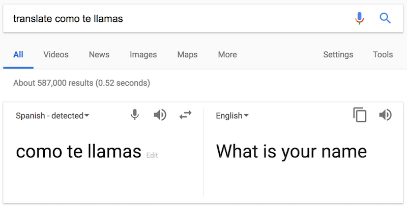 If you need a language translator, simply type translate. You can also add a word or phrase to the search and immediately get the English version. Keep in mind that these translations are not always perfect, so keep things simple to ensure you get more accurate results.