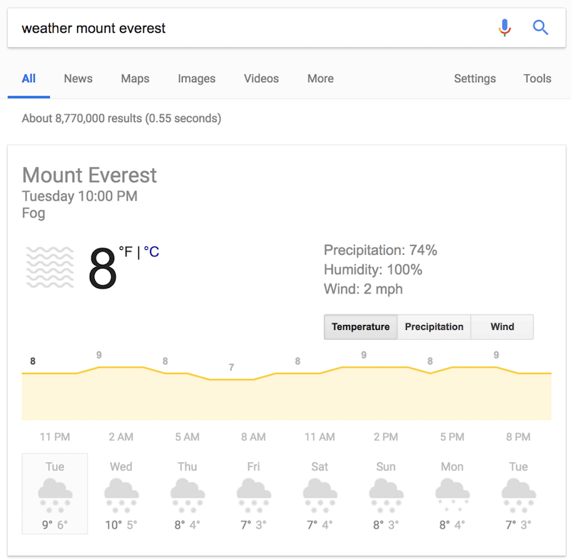 Whenever you need your local weather, type weather, or add a place name to get the forecast for almost any place on Earth, from Phoenix to Mount Everest.